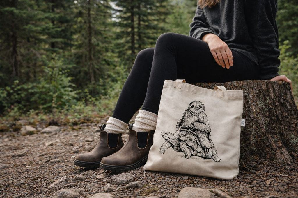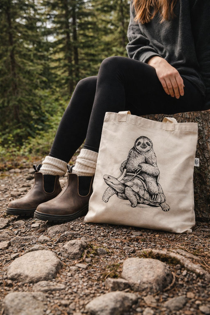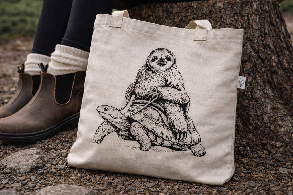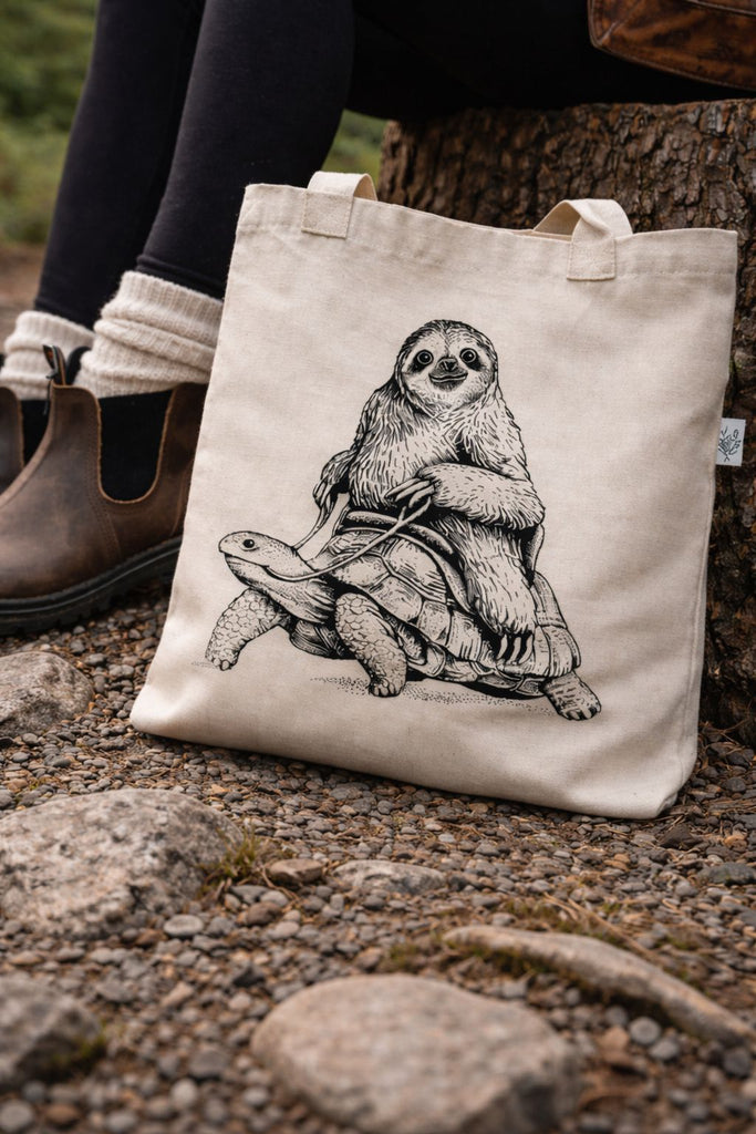 Simple but durable tote bag with a fun Sloth and Tortoise design