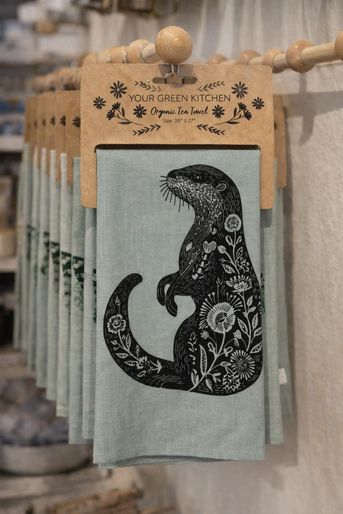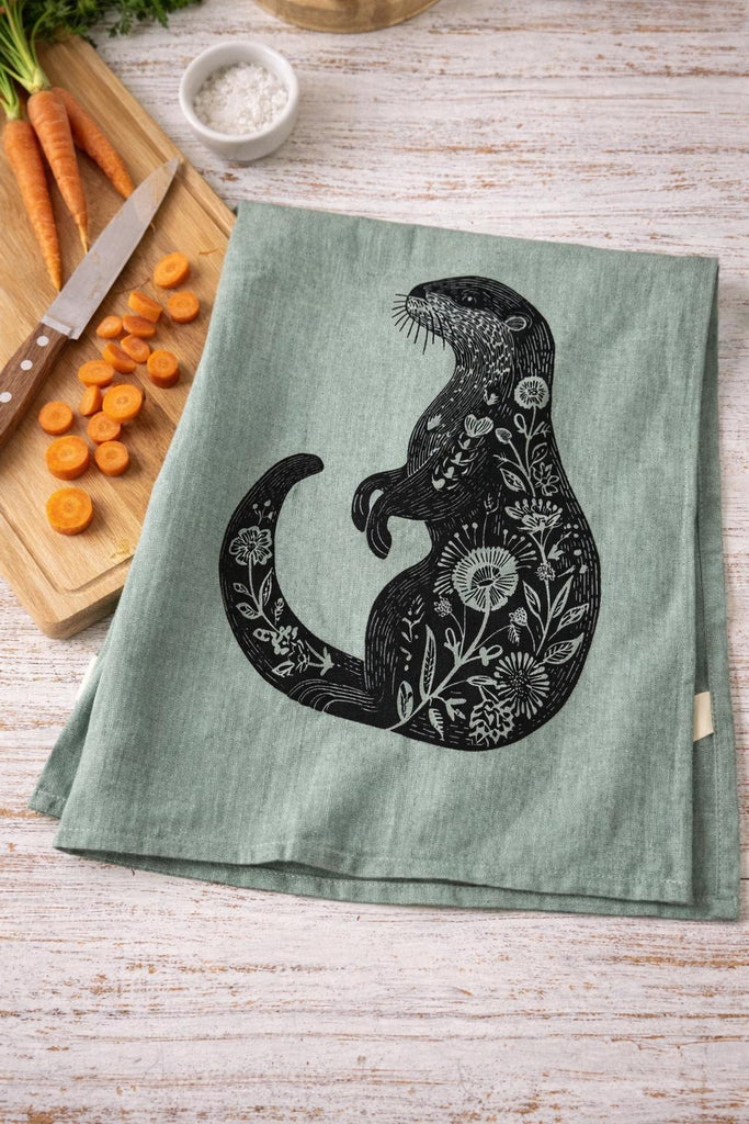 "Sea Otter" Green Smoke Linen Tea Towel